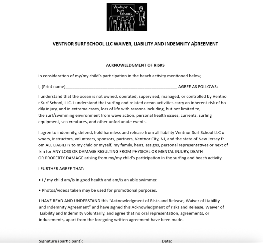 Surf School Liability Waiver Complete the Ventnor Surf School Liability Waiver and send it back to Shaun prior to participating in any camps or lessons.